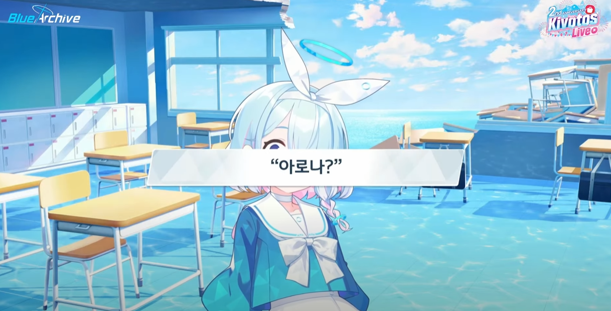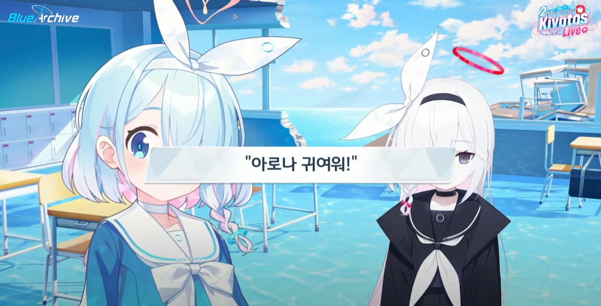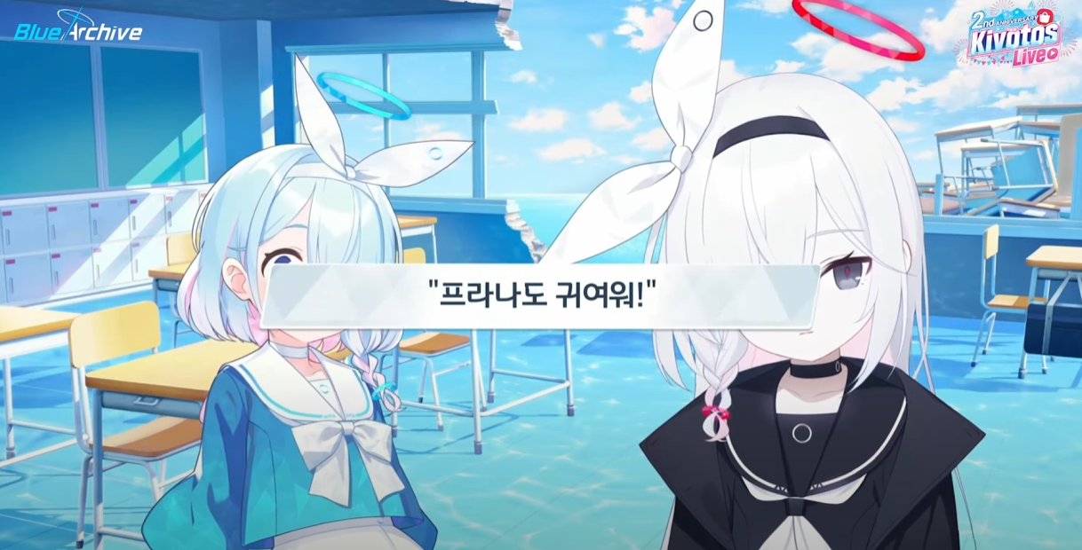 첫번째로 드디어 한섭에도 아로나와 프라나가 라이브 방송에서 얼굴을 비췄다는 것이다. 이미 4차pv가 한섭에 나왔을 때 총학생회장의 목소리가 우리말로 더빙되었고, 이번 키보토스 라이브에서 선보인 건 그 연장선이다.